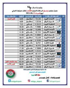 أعلنت إدارة مطاري معيتيقة بالعاصمة طرابلس، وبنينا بمدينة بنغازي، عن مواعيد رحلات الطيران من وإلى المطارين المقررة، اليوم السبت، الموافق 12 يونيو 2021.