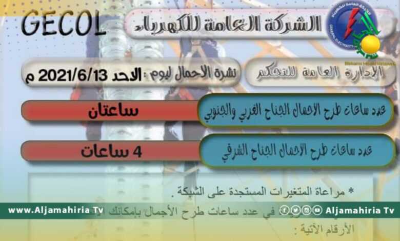 أعلنت الشركة العامة للكهرباء، عن عدد ساعات طرح الأحمال، اليوم الأحد، في عموم مناطق ليبيا.