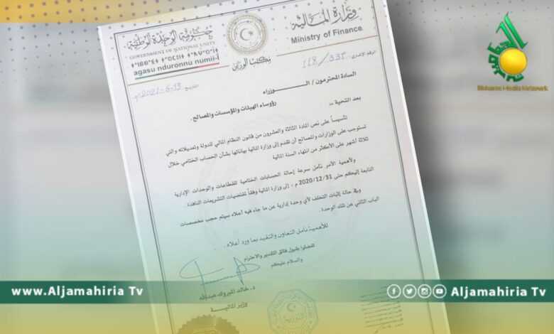 طالبت وزارة المالية بـ حكومة الوحدة الوطنية المؤقتة، من الوزارات و المصالح والهيئات سرعة إحالة الحسابات الختامية إليها، وذلك حتى تاريخ 31 ديسمبر الماضي.