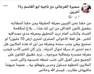 وكتبت وزير الشؤون الاجتماعية الأسبق سميرة الفرجاني، على صفحتها على فيسبوك تدوينة قالت فيها ” من حقنا نحن الليبيين معرفه الحقيقة ومن حقنا المطالبة بتفعيل قانون القذافي من اين لك هذا…. بلاغ لمكافحة الفساد والنائب العام نريد التحقيق ومعرفه مدي مصداقيه الخبر.. هل فعلا الاخواني المشري اشترى ارض 70 مليون؟”