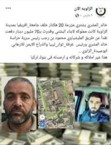 وذكرت المصادر أن ثمن المزرعة قدر بحوالي 70 مليون دينار، دفعت نقدا عن طريق المليشياوي محمود بن رجب رئيس سرية حراسة المشري ورئيس مليشيا “ثوار ليبيا” والذراع الأيمن للإرهاب أبو عبيدة الزاوية.