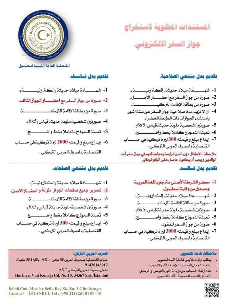 أعلنت القنصلية العامة الليبية اسطنبول، عن إعادة فتح باب التسجيل في استخراج جوازات السفر.
