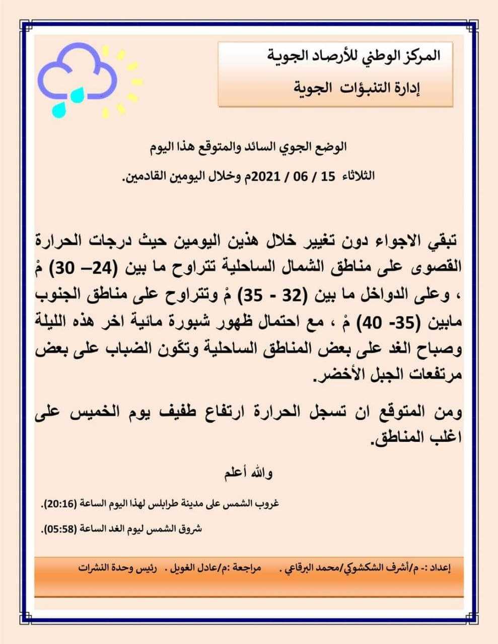 يتوقع مركز الأرصاد أن تبقى الأجواء دون تغيير هذا اليوم ويوم الغد ،وتسجل الحرارة ارتفاع طفيف يوم الخميس على اغلب المناطق