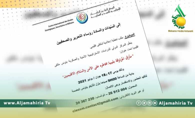 وفي رسالة وجهها المركز الدولي للدراسات الاستراتيجية الأمنية والعسكرية بتونس، لقناة الجماهيرية، أعلن عزمه تنظيم ملتقى إقليمي تحت عنوان ” مأزق المرتزقة بليبيا: مخاطرة على الأمن والسلام الإقليميين”.