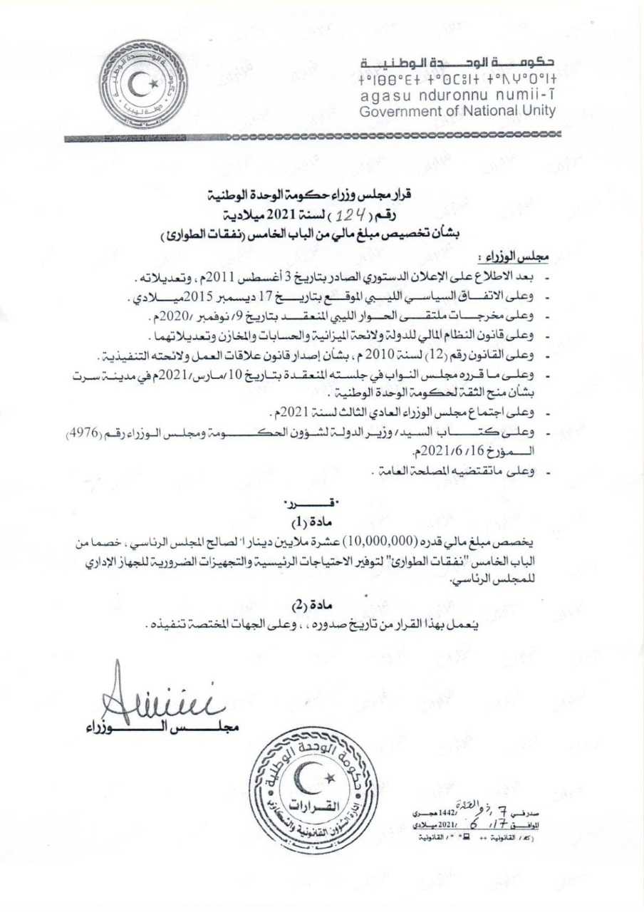 وجاء في القرار الصادر تحت رقم 124 لسنة 2021 بشأن تخصيص مبلغ مالي، أن هذا المبلغ يخصص لتوفير الاحتياجات الرئيسية والتجهيزات الضرورية للجهاز الإداري للمجلس الرئاسي.
