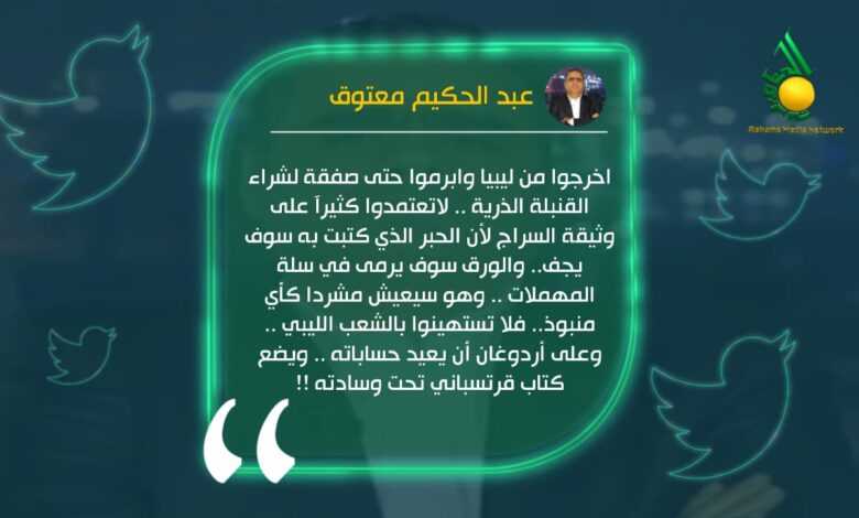 وقال الكاتب الصحفي عبد الحكيم معتوق: “اخرجوا من ليبيا وابرموا حتى صفقة لشراء القنبلة الذرية .. لا تعتمدوا كثيرا على وثيقة السراج لأن الحبر الذي كتبت به سوف يجف.. والورق سوف يرمى في سلة المهملات .. وهو سيعيش مشردا كأي منبوذ.. فلا تستهينوا بالشعب الليبي .. وعلى أردوغان أن يعيد حساباته .. ويضع كتاب قرتسباني تحت وسادته !!”