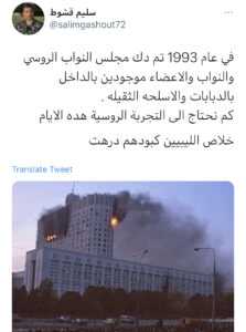 وغرد “قشوط” على حسابه بـ”تويتر”: “في عام 1993 تم دك مجلس النواب الروسي والنواب والأعضاء موجودين بالداخل بالدبابات والأسلحة الثقيلة”.