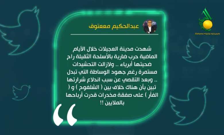 وقال معتوق في تغريدة له على تويتر: “شهدت مدينة العجيلات خلال الآيام الماضية حرب ضارية بالأسلحة الثقيلة راح ضحيتها أبرياء .. ولازالت التحشيدات مستمرة رغم جهود الوساطة التي تبدل”.