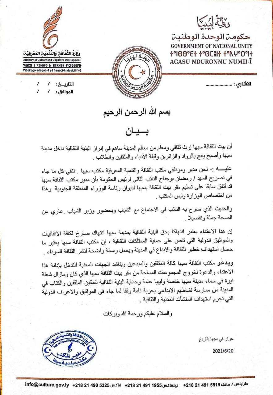 نفى مدير وموظفو مكتب الثقافة والتنمية المعرفية بسبها، في بيان، ما جاء في تصريحات نائب رئيس حكومة الوحدة المؤقتة رمضان أبو جناح، بأنه قد اتفق سابقا على تسليم مقر بيت الثقافة سبها لديوان رئاسة الوزراء والمنطقة الجنوبية، موضحين أن ذلك من اختصاص الوزارة وليس المكتب.