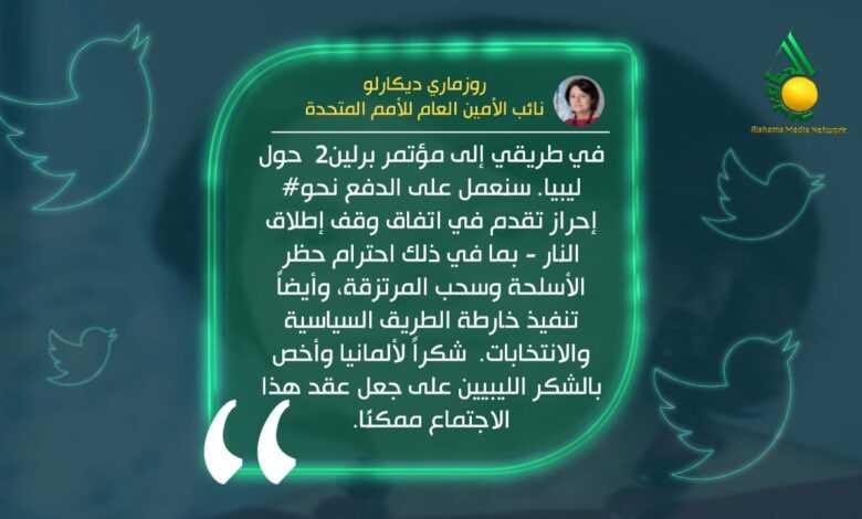 وقالت نائب الأمين العام للأمم المتحدة، في تغريدة عبر حسابها على موقع “تويتر”: ‏”في طريقي إلى مؤتمر “برلين 2” حول ‎ليبيا…سنعمل على الدفع نحو إحراز تقدم في اتفاق وقف إطلاق النار، بما في ذلك احترام حظر الأسلحة وسحب المرتزقة، وأيضاً تنفيذ خارطة الطريق السياسية والانتخابات”