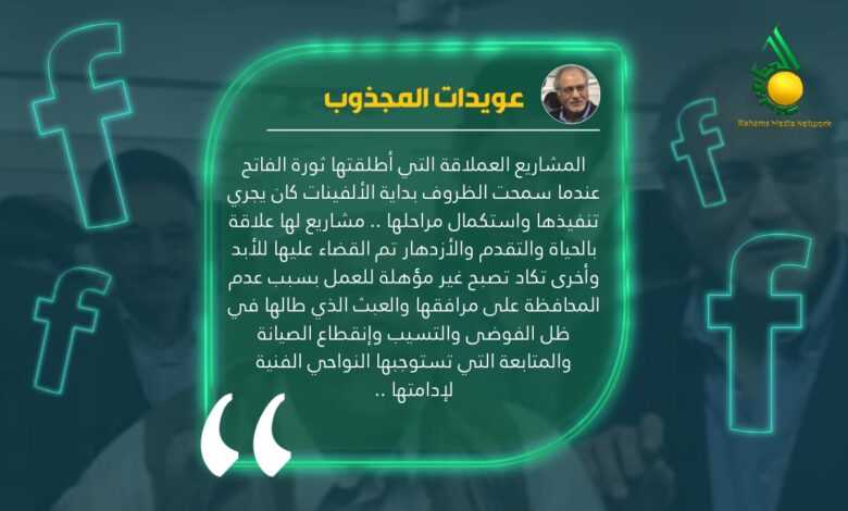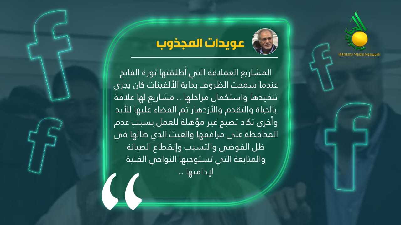 من هذه المشروعات .. مشروع السكك الحديدية الذي كان مستهدف أن يربط البلاد بشبكة تمتد شرقا وغربا وجنوبا .. وإستكمال مراحل تنفيذ مشروع النهر الصناعي .. بالإضافة إلى مئات الآلاف من الوحدات السكنية موزعة على جميع المدن والمناطق .. والطريق المزدوج الذي كان سيربط بين رأس جدير ومساعد والذي التزم الطليان بتنفيذه في إطار تنفيذ إتفاقية التعويض والأعتذار .. وعدد من المطارات الدولية والمحلية ..
