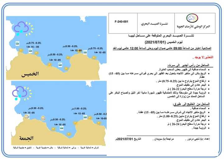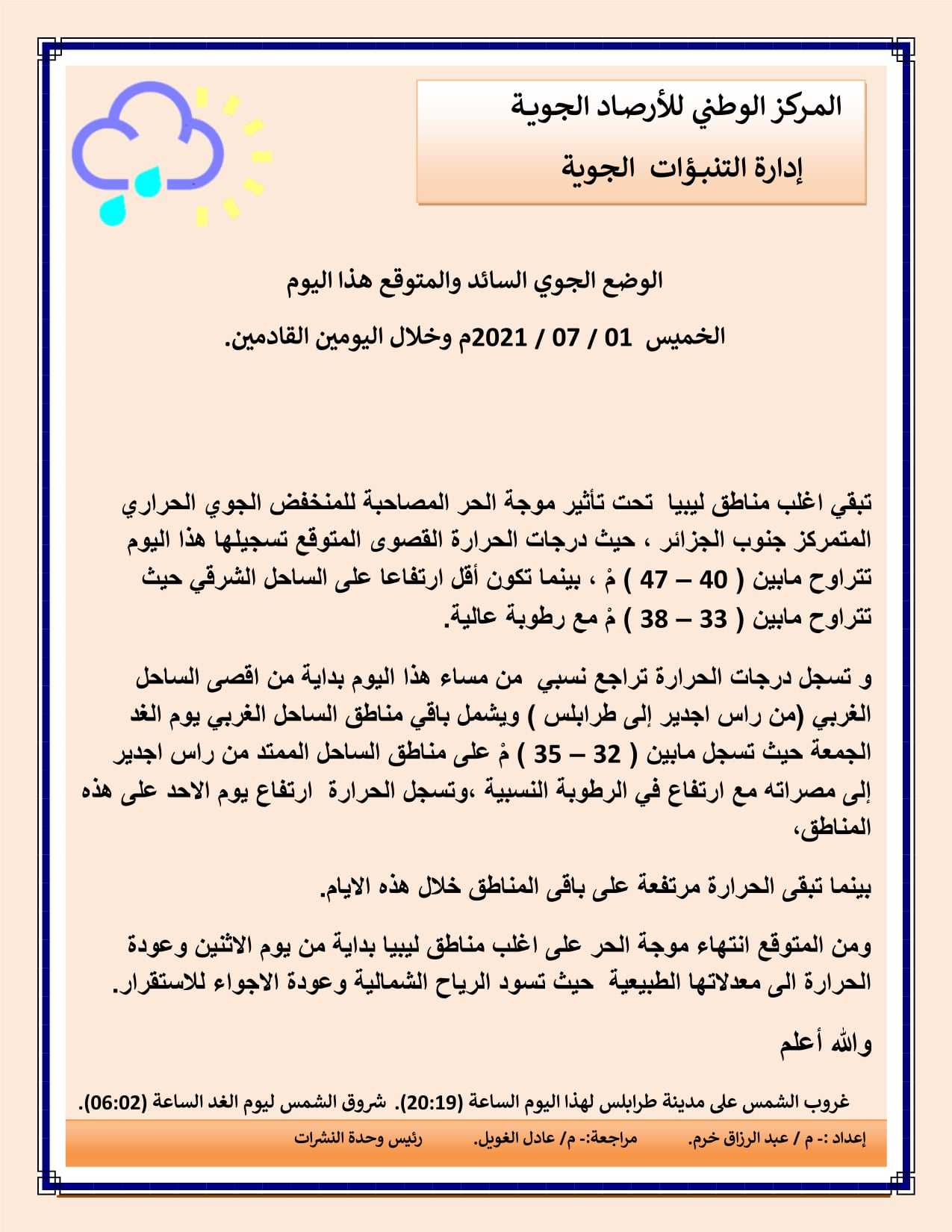 السماء صافية بوجه عام، مع ظهور شبورة مائية آخر الليل والصباح الباكر على الساحل من رأس اجدير إلى الخمس، والرياح جنوبية شرقية إلى جنوبية غربية، معتدلة السرعة، تتحول تدريجيا من مساء اليوم إلى شمالية غربية فشمالية شرقية، بداية من أقصي الساحل الغربي، ودرجات الحرارة القصوى تتراوح بين 40 و47 درجة مئوية، وتسجل تراجع تدريجي من مساء اليوم على مناطق الساحل الممتد من راس اجدير إلى طرابلس.