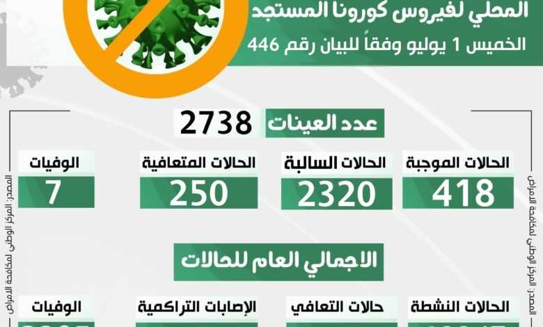 التحديث اليومي للوضع الوبائي المحلي لفيروس كورونا المستجد ليوم الخميس 01 يوليو 2021 م وفقا للبيان رقم (446) .