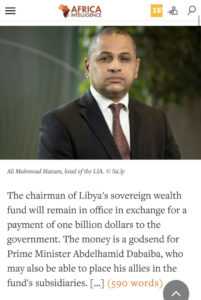 وأضاف موقع أفريكا انتيليجنس أن الأموال هبة من السماء لرئيس الوزراء عبد الحميد الدبيبة ، الذي قد يكون أيضًا قادرًا على وضع حلفائه في الشركات التابعة للصندوق.