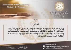 أحالت وزارة المالية بحكومة الوحدة المؤقتة، اليوم الأربعاء، منحة الطلبة الدارسين بالخارج إلى مصرف ليبيا المركزي.