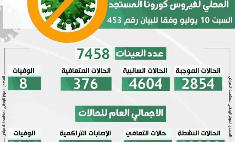 استلم المركز الوطني لمكافحة الأمراض عدد (7458) عينة موزعة على المختبرات، وجاءت بيانات التحديث اليومي للوضع الوبائي المحلي لفيروس كورونا ليوم السبت 10 يوليو 2021 وفقا للبيان رقم (453) كالتالي:-