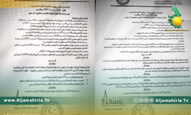 قرر رئيس حكومة الوحدة الوطنية المؤقتة، عبد الحميد الدبيبة إلزام، كل الوزارات والهيئات والمؤسسات والمصالح والشركات العامة والخاصة وما في حكمها، باتخاذ التدابير الاحترازية والوقائية للحدّ من انتشار فيروس كورونا.