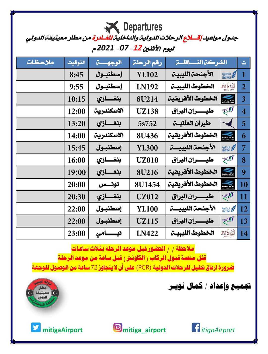 أعلنت إدارة مطاري معيتيقة بالعاصمة طرابلس، وبنينا بمدينة بنغازي، عن مواعيد رحلات الطيران من وإلى المطارين المقررة، اليوم الإثنين، 12 يوليو 2021.
