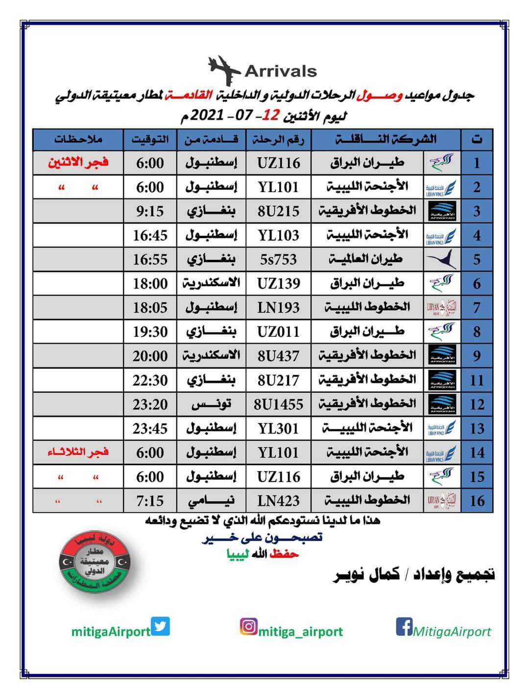 • مواعيد رحلات الطيران من وإلى مطار معيتيقة
