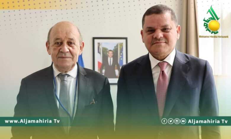 وناقش الدبيبة مع وزير خارجية فرنسا جان إيف لودريان، دعم الاستقرار والمسار الانتخابي الديمقراطي.