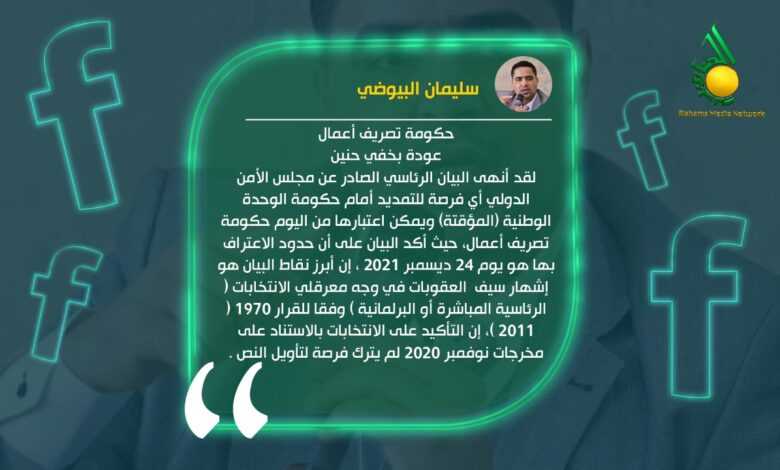 وقال البيوضي في تدوينة له على صفحته على فيسبوك عنونها بحكومة تصريف أعمال.. عودة بخفي حنين”: “لقد أنهى البيان الرئاسي الصادر عن مجلس الأمن الدولي أي فرصة للتمديد أمام حكومة الوحدة الوطنية (المؤقتة) ويمكن اعتبارها من اليوم حكومة تصريف أعمال، حيث أكد البيان على أن حدود الاعتراف بها هو يوم 24 ديسمبر 2021 ، إن أبرز نقاط البيان هو إشهار سيف  العقوبات في وجه معرقلي الانتخابات ( الرئاسية المباشرة أو البرلمانية ) وفقا للقرار 1970 ( 2011 )، إن التأكيد على الانتخابات بالاستناد على مخرجات نوفمبر 2020 لم يترك فرصة لتأويل النص” .