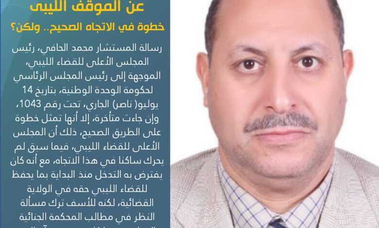 رسالة المستشار محمد الحافي، رئيس المجلس الأعلى للقضاء الليبي، الموجهة إلى رئيس المجلس الرئاسي لحكومة الوحدة الوطنية، بتاريخ 14 يوليو( ناصر) الجاري، تحت رقم 1043، وإن جاءت متأخرة، إلا أنها تمثل خطوة على الطريق الصحيح، ذلك أن المجلس الأعلى للقضاء الليبي، فيما سبق لم يحرك ساكنا في هذا الاتجاه، مع أنه كان يفترض به التدخل منذ البداية بما يحفظ للقضاء الليبي حقه في الولاية القضائية، لكنه للأسف ترك مسألة النظر في مطالب المحكمة الجنائية الدولية بيد ما كان يسمى – آنذاك – المجلس الانتقالي ووزارة العدل بالحكومة الإنتقالية.