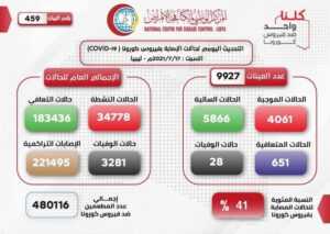 استلم مركز مكافحة الأمراض عدد (9927) عينة موزعة على المختبرات، وجاءت بيانات التحديث اليومي لـ كورونا وفقا للبيان رقم (459) كالتالي:-