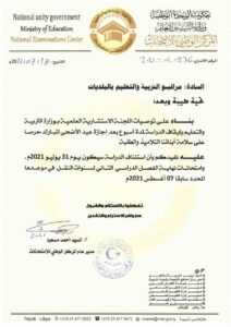 جاء ذلك في رسالة وجهها مدير عام مركز الامتحانات لمراقبي التربية والتعليم بالبلديات، تضمن التأكيد أن تحديد هذه المواعيد جاء بناء على توصيات اللجنة الاستشارية العلمية بالوزارة بإيقاف الدراسة لمدة أسبوع بعد إجازة عيد الأضحى المبارك حرصا على سلامة الطلاب.