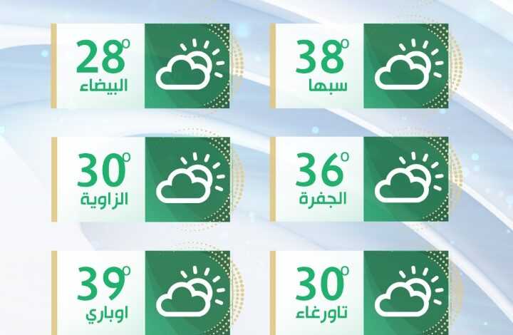 - درجات الحرارة القصوى: تتراوح بين 28 و32 درجة مئوية، بينما تكون بين 37 و40 درجة مئوية على جالو والجغبوب.