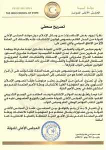 وأكد مجلس الدولة الإخواني، خلال البيان، تمسكه بالتوزيع المنصوص عليه في قانون انتخاب ما عرف بـ “المؤتمر العام” ومجلس النواب، وذلك فيما يخص عدد الدوائر الانتخابية وعدد المقاعد في الجسم التشريعي، وأن أي تعديل لابد أن يتم بالتوافق بين المجلسين، بحسب البيان.