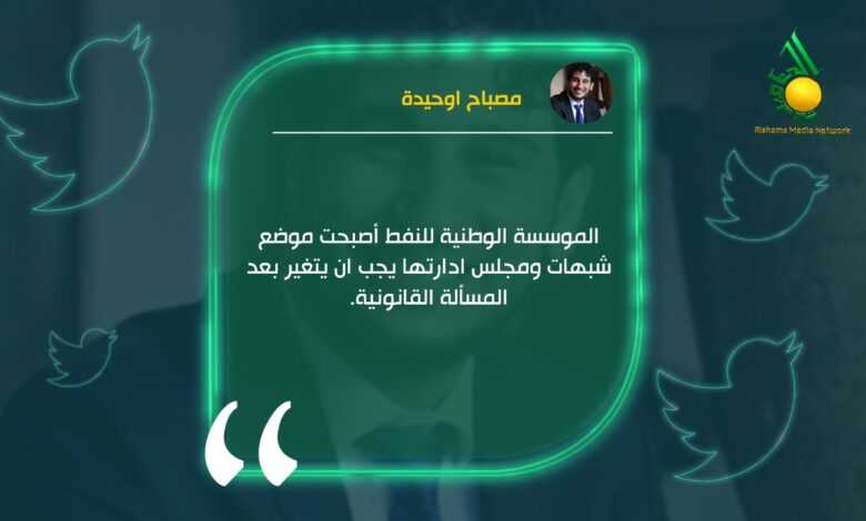 وقال أوحيده في تغريدة له على تويتر: “المؤسسة الوطنية للنفط أصبحت موضع شبهات ومجلس ادارتها يجب ان يتغير بعد المسألة القانونية”.