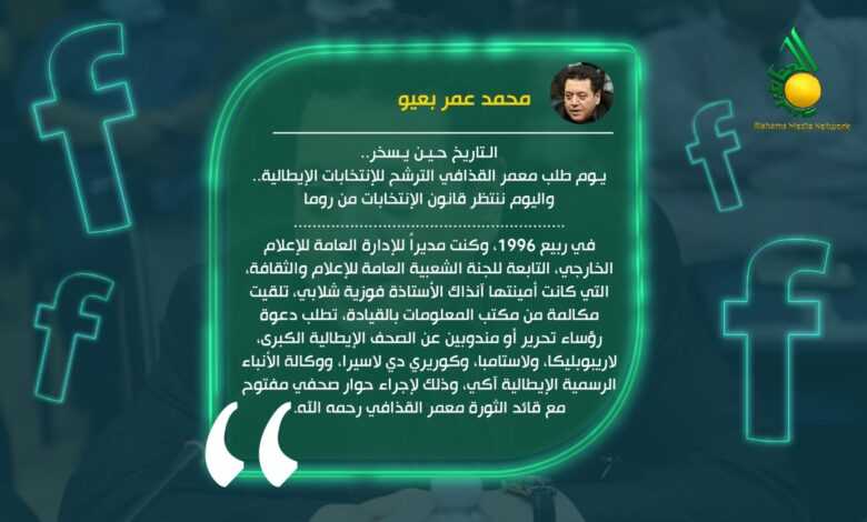 عبر حسابه على موقع التواصل الاجتماعي،  فيس بوك، تذكر محمد بعيو، رئيس مؤسسة الإعلام سابقًا، بعضا من صفحات المجد الليبي وقت القائد الشهيد معمر القذافي، عندما دعا أكبر صحفيي إيطاليا ليعرض عليهم فكرة الترشح للانتخابات الايطالية، ليؤكد لهم آنذاك في التسعينيات أن إيطاليا أصغر كثيرا من مشاركتها في المؤامرة على ليبيا وحصارها أنذاك، واليوم بعدما تردت الأحوال، يكلف عقيلة صالح لجنة بالذهاب إلى إيطاليا للاتفاق على القاعدة الدستورية؟!!