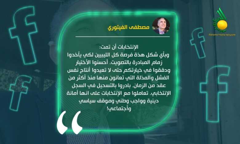 وقال الفيتوري في تدوينة له على صفحته على فيسبوك، إن “الانتخابات إن تمت وبأي شكل فهذه فرصة كل الليبيين لكي يأخدوا زمام المبادرة بالتصويت.”