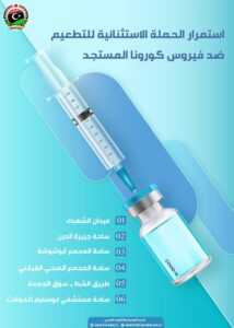 أعلنت وزارة الصحة بحكومة الوحدة المؤقتة، اليوم الأحد، عن الأماكن المخصصة لتلقي التطعيم ضد فيروس كورونا، ضمن الحملة الاستثنائية التي أطلقها مركز مكافحة الأمراض، تحت الإشراف المباشر لوزارة الصحة.