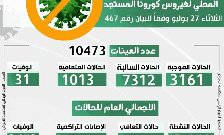 نشر مركز مكافح الأمراض التحديث اليومي للوضع لوبائي وفقا للبيان رقم (467) .