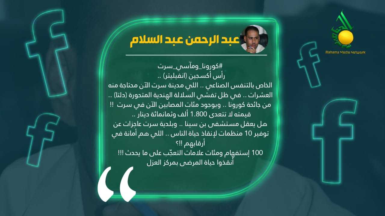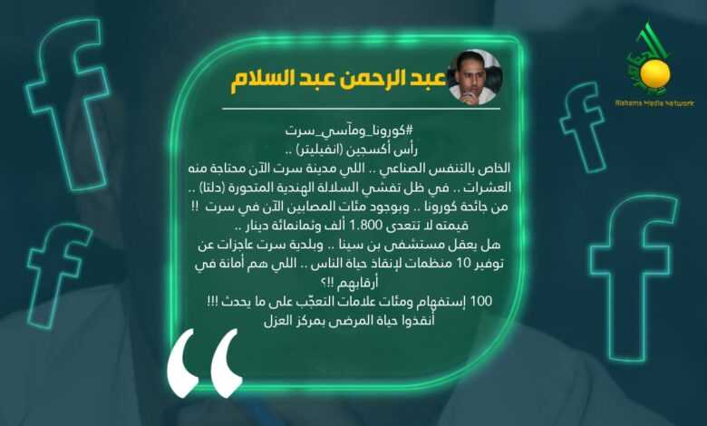 وتابع عبد الرحمن عبد السلام: “هل يعقل أن مستشفى بن سينا، وبلدية سرت عاجزان عن توفير 10 “منظمات” منه لإنقاذ حياة الناس والتي هى أمانة في أرقابهم؟! مائة علامة استفهام تحيط بهذا الوضع”