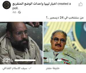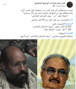 وفتحت الصفحة التصويت لروادها منذ خمسة أيام فقط، فشارك فيه أكثر من 40 ألف شخص، للتصويت لصالح الدكتور سيف الإسلام القذافي الذي حصل على أصوات 32.905 ألف صوت، فيما لم يحصل منافسه خليفة حفتر إلا على 7.160 ألف صوت فقط.
