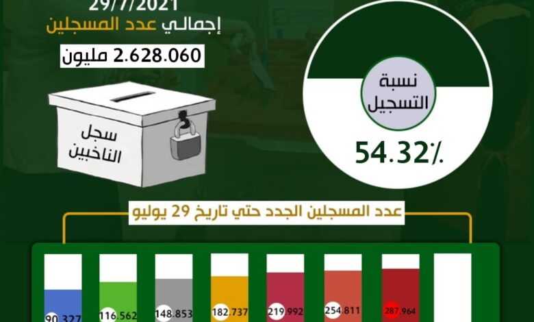 أعلنت المفوضية العليا للانتخابات، عن وصول سجل الناخبين حتى يوم الثلاثين من يوليو الجاري، إلى أكثر من مليوني و ستمائة وثمانية وعشرين ألفا، وستون ناخبًا في منظومة التسجيل.