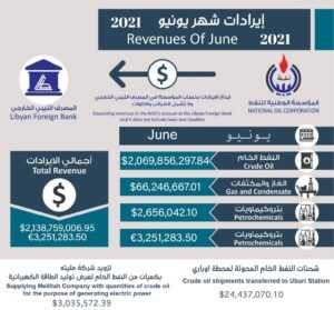 أعلنت مؤسسة النفـط أن صافي ايرادات شهر يونيو للعام 2021م من مبيعات النفط الخام والغاز والمكثفات والمنتجات النفطية والبتروكيماويات وصل الى مستويات قياسية في شهر يونيو تجاوزت الـــــ 2.13 مليار دولار أمريكي