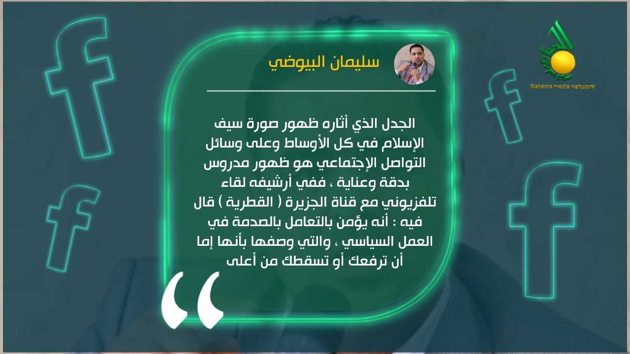 وذكر البيوضي، في تدوينة له على صفحته على فيسبوك، أن “الجدل الذي أثاره ظهور صورة سيف الإسلام في كل الأوساط وعلى وسائل التواصل الاجتماعي هو ظهور مدروس بدقة وعناية ، ففي أرشيفه لقاء تلفزيوني مع قناة الجزيرة ( القطرية ) قال فيه : أنه يؤمن بالتعامل بالصدمة في العمل السياسي ، والتي وصفها بأنها إما أن ترفعك أو تسقطك من أعلى ، وإذا ما قيمنا ردود الفعل على هذا الظهور سنجدها في ثلاث مستويات :