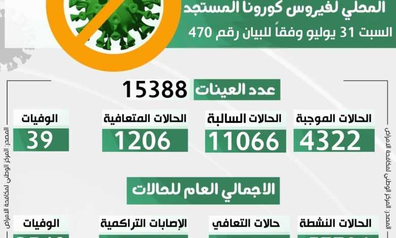 استلم مركز مكافحة الأمراض عدد (15388) عينة موزعة على المختبرات، وجاء التحديث اليومي للوضع الوبائي وفقا للبيان رقم (470) كالتالي: