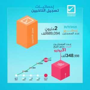 أعلنت المفوضية العليا للانتخابات، عن وصول سجل الناخبين حتى يوم الحادي والثلاثين من يوليو، إلى أكثر من مليوني و ستمائة وتسعة وثمانون ألفا، وأربعة وتسعون ناخبًا في منظومة التسجيل.