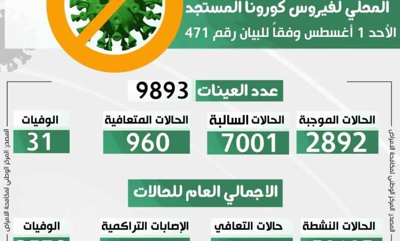 استلم مركز مكافحة الأمراض عدد (9893) عينة موزعة على المختبرات، وجاء التحديث اليومي للوباء وفقا للبيان رقم (471) كالتالي: