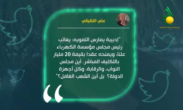 وكتب التكبالي على تويتر، “إدبيبة يمارس التمويه؛ يعاتب رئيس مجلس مؤسسة الكهرباء علنًا، ويمنحه عقدا بقيمة 20 مليار بالتكليف المباشر!
