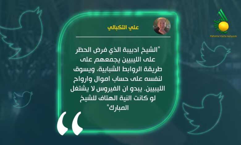 “الشيخ ادبيبة الذي فرض الحظر على الليبيين يجمعهم على طريقة الروابط الشبابية، ويسوق لنفسه على حساب أموال وأرواح الليبيين. مضيفًا: يبدو أن الفيروس لا يشتغل لو كانت النية الهتاف للشيخ المبارك”.