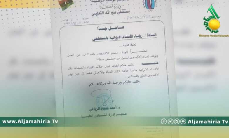 طالب مستشفى صبراتة التعليمي، من رؤساء الأقسام الإيوائية بالمستشفى، إيقاف قبول حالات الإيواء والعمليات بكل الأقسام ما عدا حالات إنقاذ الحياة والانعاش إلى حين توفر الأكسجين بالمستشفى.