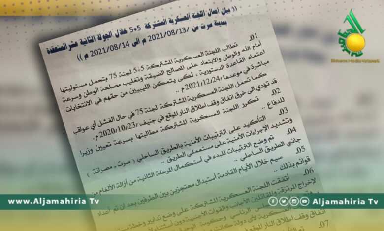 وحملت اللجنة في بيانها الذي طالعته “قناة الجماهيرية”، لجنة 75  “ملتقى الحوار السياسي”، أي عواقب قد تؤدي إلى خرق اتفاق وقف إطلاق النار الموقع في جنيف.