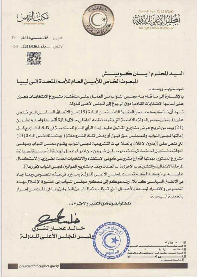 أرسل الإخواني خالد المشري، رئيس المجلس الأعلى للدولة، خطابًا إلى المبعوث الأممي الخاص إلى ليبيا يان كوبيش، حذره فيها بما أسماه بـ تجاوز مجلس النواب، لبنود الاتفاق السياسي وانفراده بمناقشة مشروع قانون الانتخابات القادمة، دون الرجوع للمجلس الأعلى للدولة الإخواني.