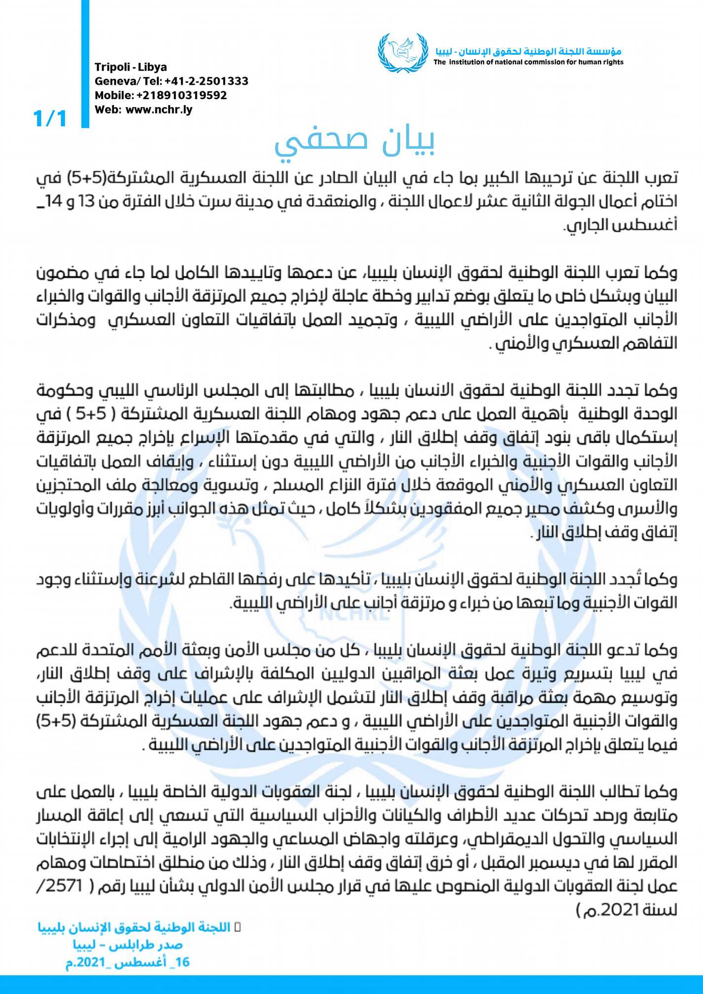 أعلنت لجنة حقوق الانسان الليبية، عن ترحيبها بما جاء في البيان الصادر عن اللجنة العسكرية المشتركة (5+5) في اختام أعمال الجولة ال12، والتي عقدت في سرت خلال يومي 13و14 أغسطس الجاري.
