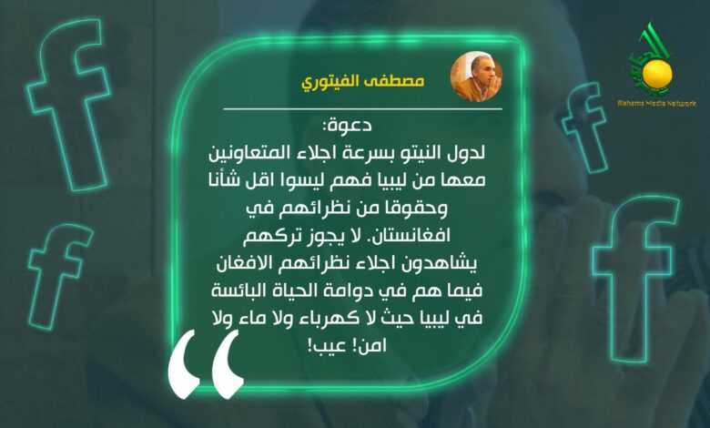 وقال الفيتوري في تدوينة له على فيسبوك “دعوة لدول النيتو بسرعة اجلاء المتعاونين معها من ليبيا فهم ليسوا اقل شأنا وحقوقا من نظرائهم في أفغانستان”.